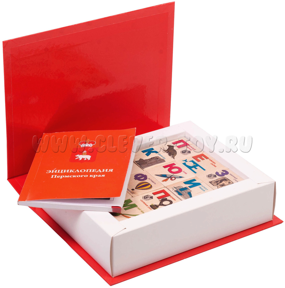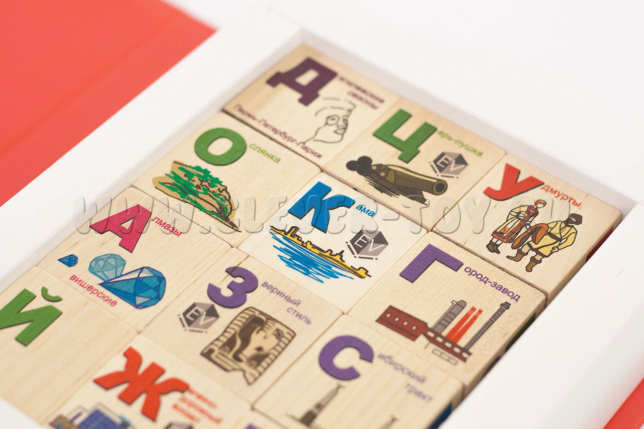 Набор «Энциклопедия Пермского края» состоит из 12 деревянных кубиков, на каждой грани которого нанесены буквы русского алфавита и картинка, изображающая символы истории, природы и культуры Пермского края: