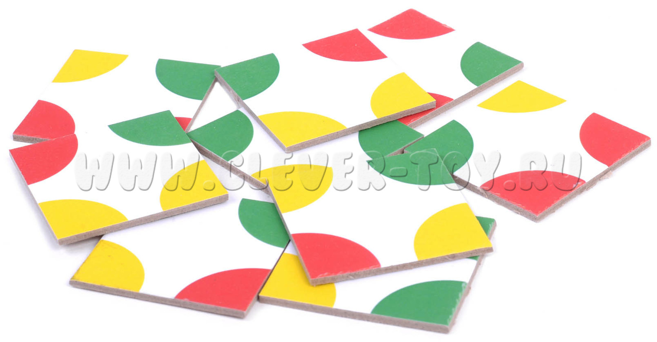 Игровые элементы этой головоломки - набор из 9 квадратных фишек с нанесенными на их углах разноцветными секторами круга. Следуя инструкции попробуйте выполнить все задания: от простых до сложных.