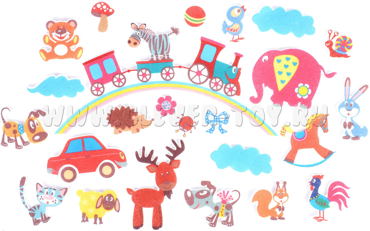 - грибок, тучки, цветочек, бантик, радуга с паровозиками, куда можно посадить зверей;