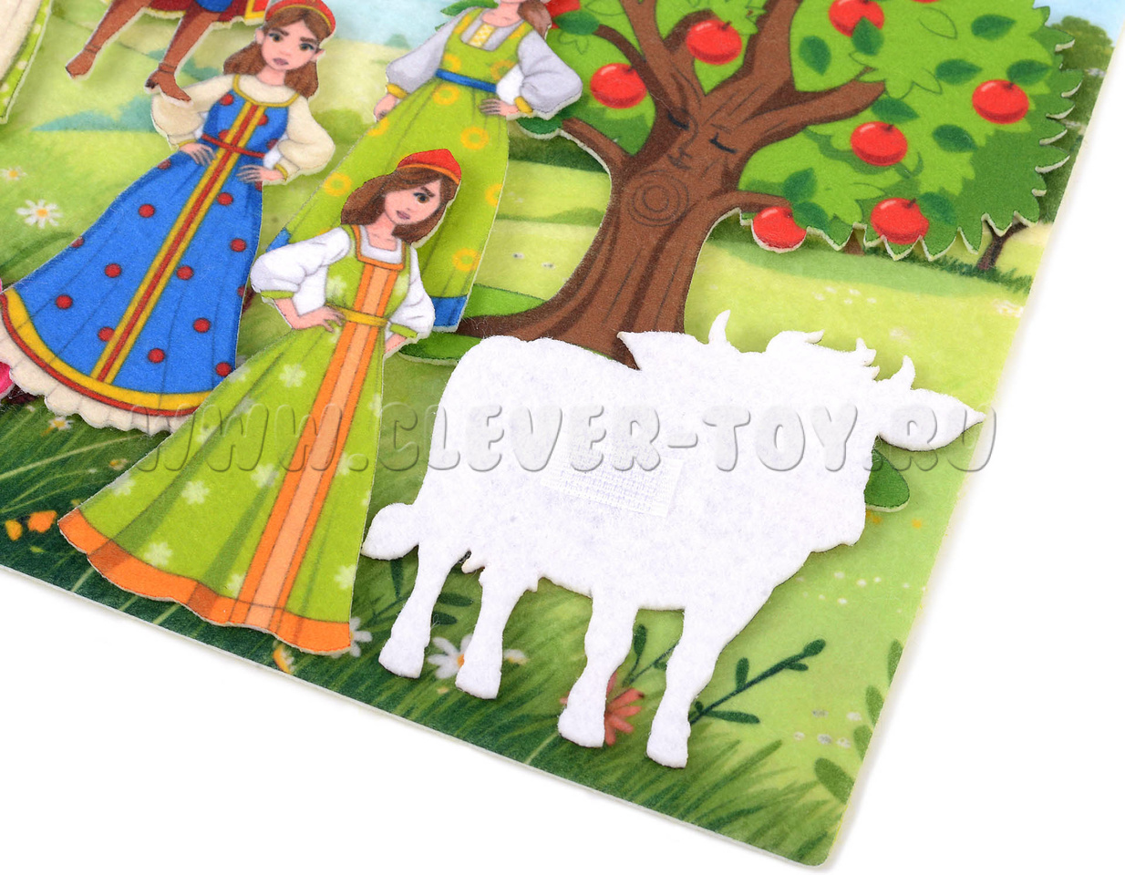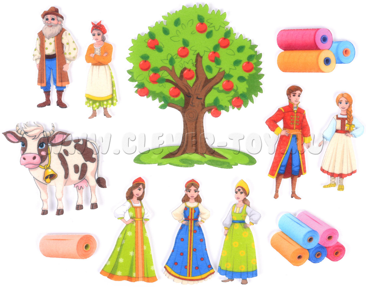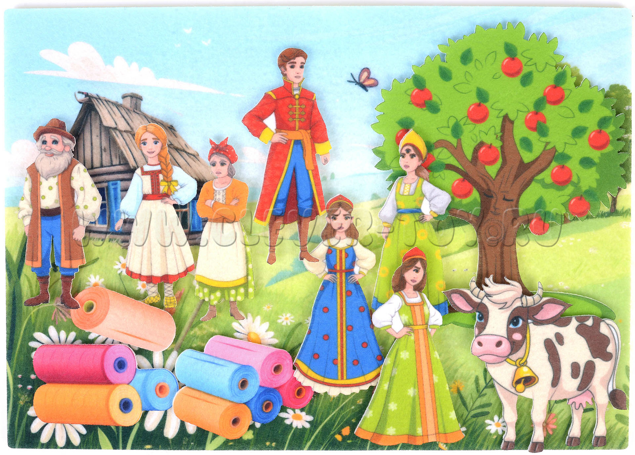 • Фигурки на липучках: Хаврошечка, три сестры, мачеха, волшебная коровка, барский сын, яблоня.