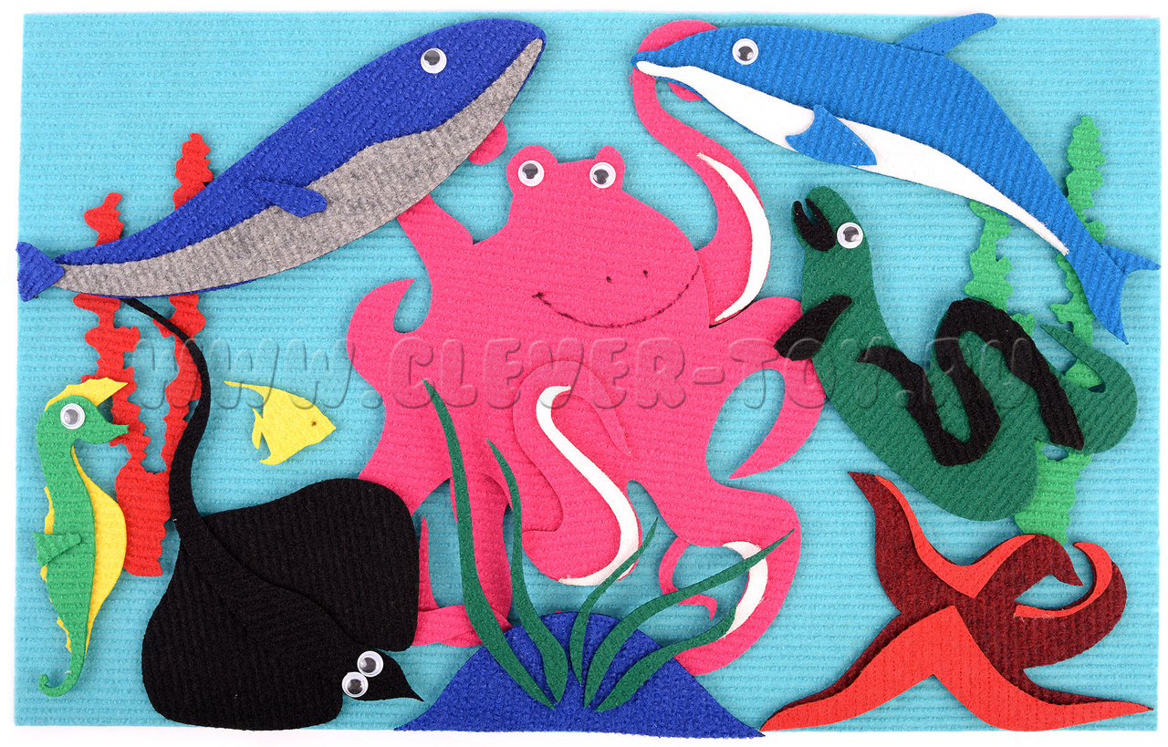 • обитатели моря: осьминог, касатка, морской котик, тюлень, кит, акула, скат, медуза, морской конёк, дельфин, мурена, морская звезда, рыбка;
