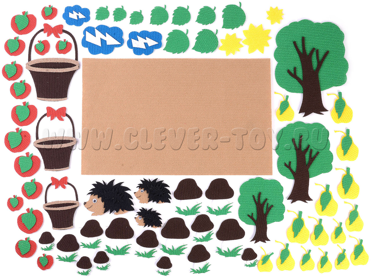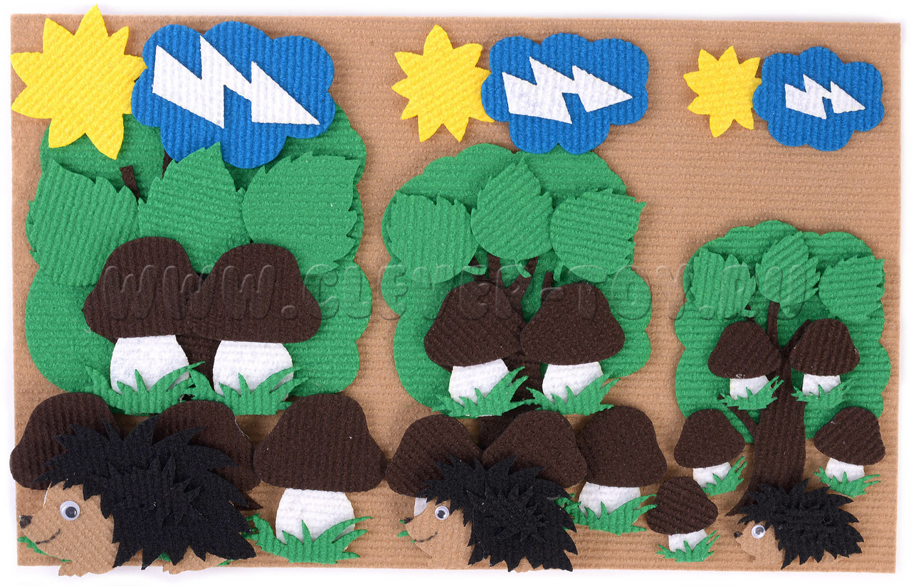 • дерево, солнышко, тучка с молнией, корзинка, ёжик маленького, среднего и большого размера (по три шт. каждого вида);