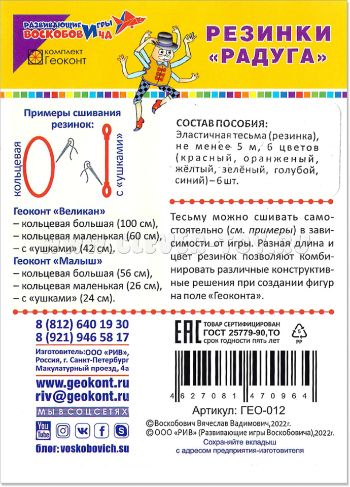 Описание продукта. Набор цветных резинок - это увлекательное дополнение к игровой системе "Геоконт", которое открывает безграничные возможности для детского творчества. Удобные эластичные элементы можно легко преобразовать в кольцевые формы или резинки с петлями, что делает игру ещё более интересной и разнообразной.