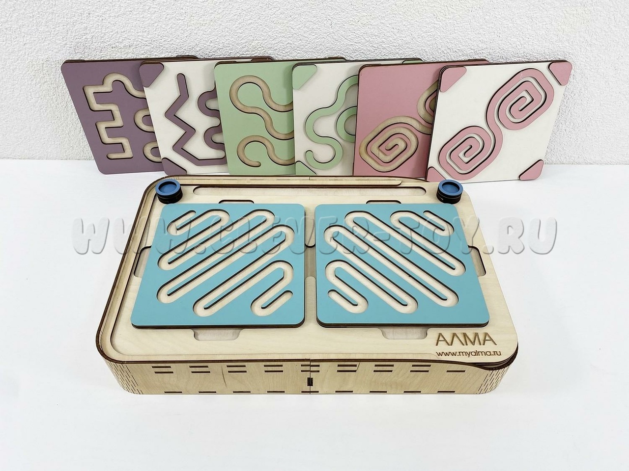 Два лабиринта с изображениями, расположенными симметрично, вставляются в пазы, и ребёнок проходит их с помощью специальных пальчиковых фишек.