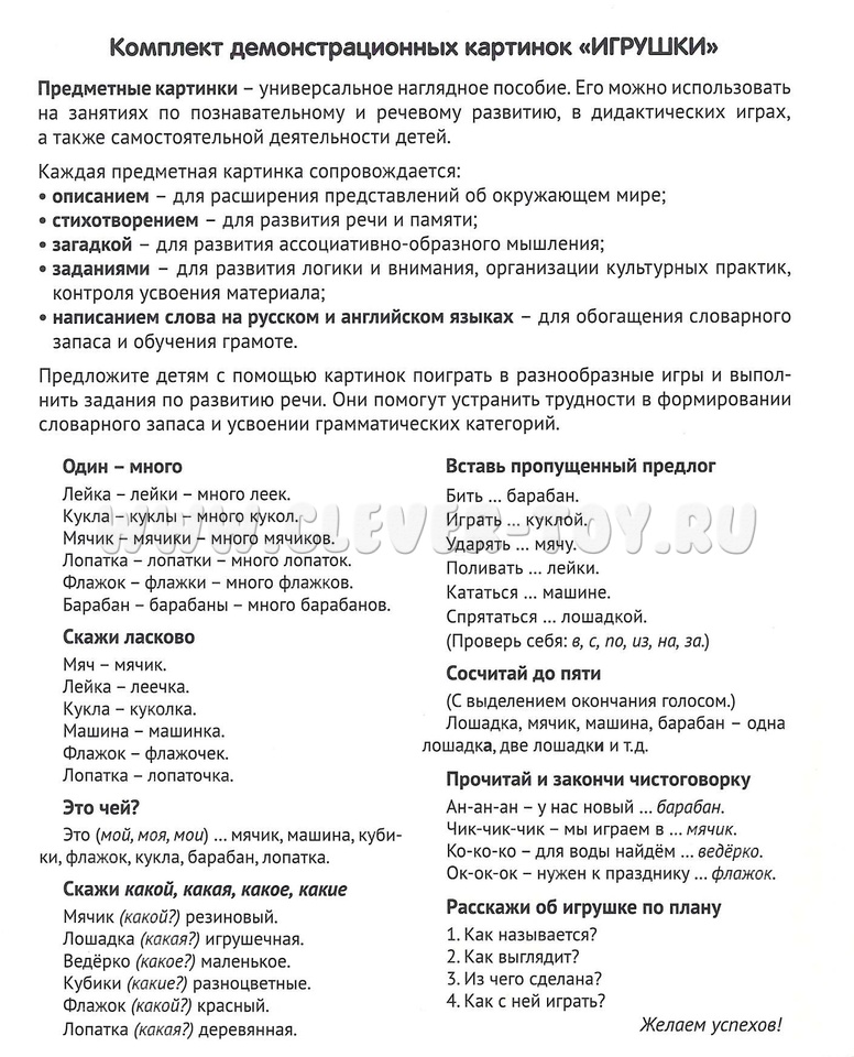16 демонстрационных картинок для познавательного и речевого развития. На обороте каждой предметной картинки - описание, стихотворение, загадка, вопросы для ребёнка, название на русском и английском языках.