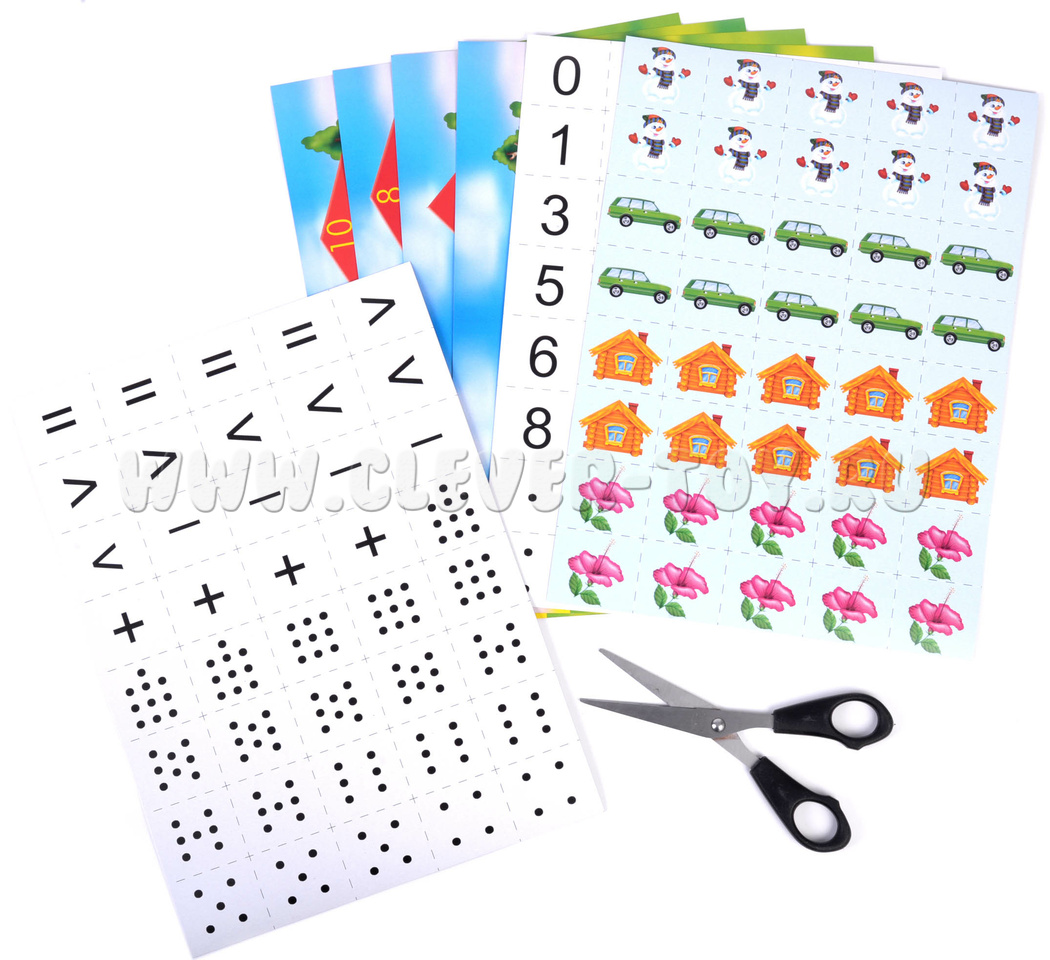 В наборе 7 карт формата А4: 8 числовых домиков (от 3 до 10), карточки с цифрами, математическими знаками, точками и предметами. Перед началом игры аккуратно разрежьте карточки по пунктирным линиям. Предложите малышу для начала внимательно рассмотреть цифры, назвать их и выложить в порядке возрастания от 1 до 10. Так же можно выложить карточки с точками (одна точка – единица, две – двойка и т.д. до 10).