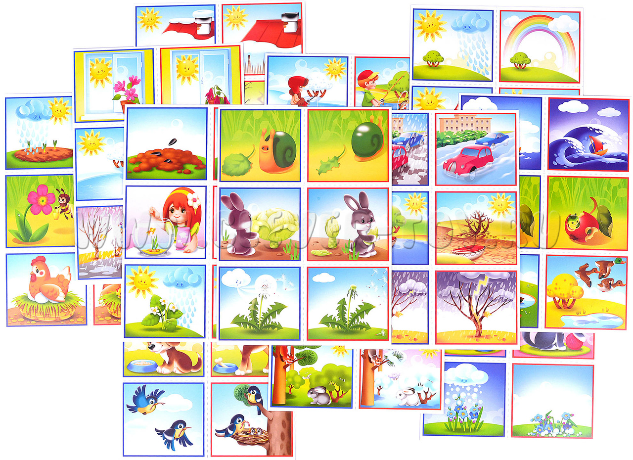Если играют несколько детей, нужно раздать карточки в синих рамках поровну. Затем ведущий показывает поочерёдно карточки в красных рамках. Те дети, которым они подходят по смыслу, берут их себе, составляя пары из двух карточек (в синей и красной рамке). Когда все пары подобраны, дети рассказывают о том, что изображено на каждой паре карточек и какая связь между этими явлениями. Выигрывает тот, кто правильно собрал все пары карточек и рассказал о них.