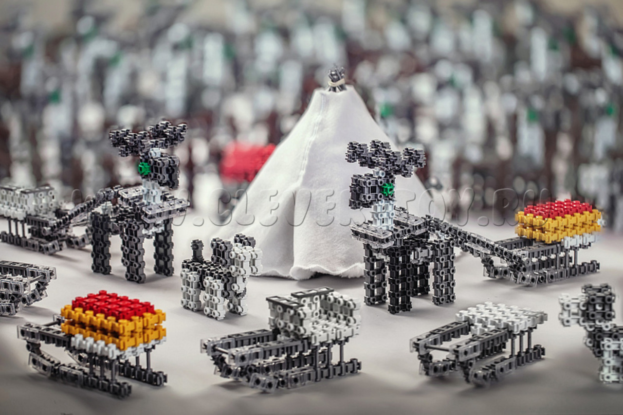 Комплект "Стойбище" (для детей 5–7 лет) предназначен для творческого конструирования чумов, оленей, собак, 4 видов нарт и кораля.