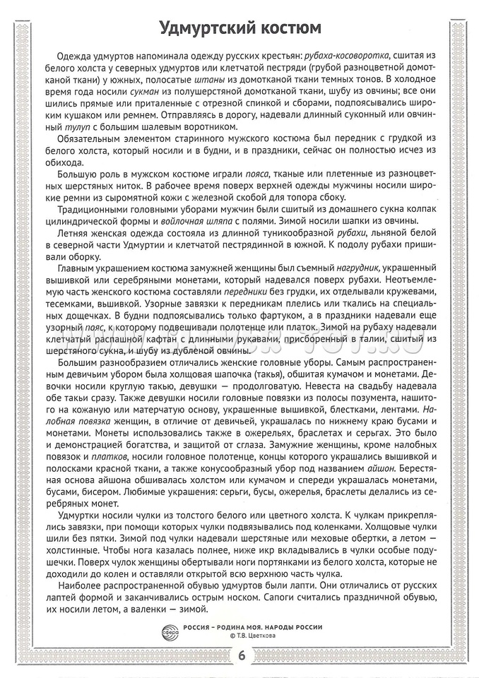 Каждый народ отличался своим уникальным стилем одежды, который варьировался в зависимости от региона. В нашем пособии представлены обобщённые варианты этих костюмов, отражающие их характерные особенности. Информация подана в сжатой форме, но при этом содержит все необходимые сведения для детей в возрасте от 6 до 11 лет.