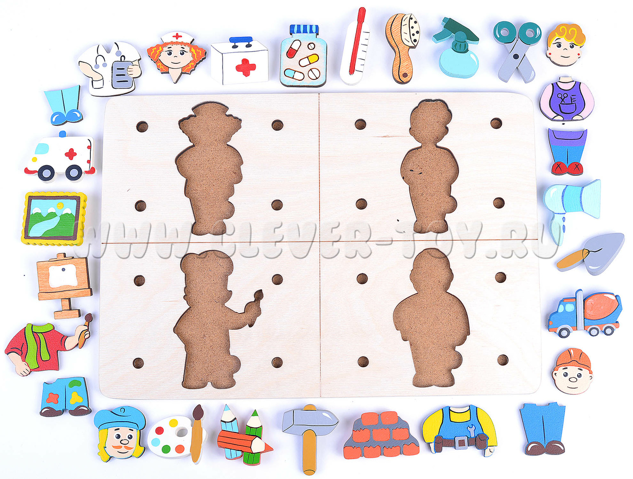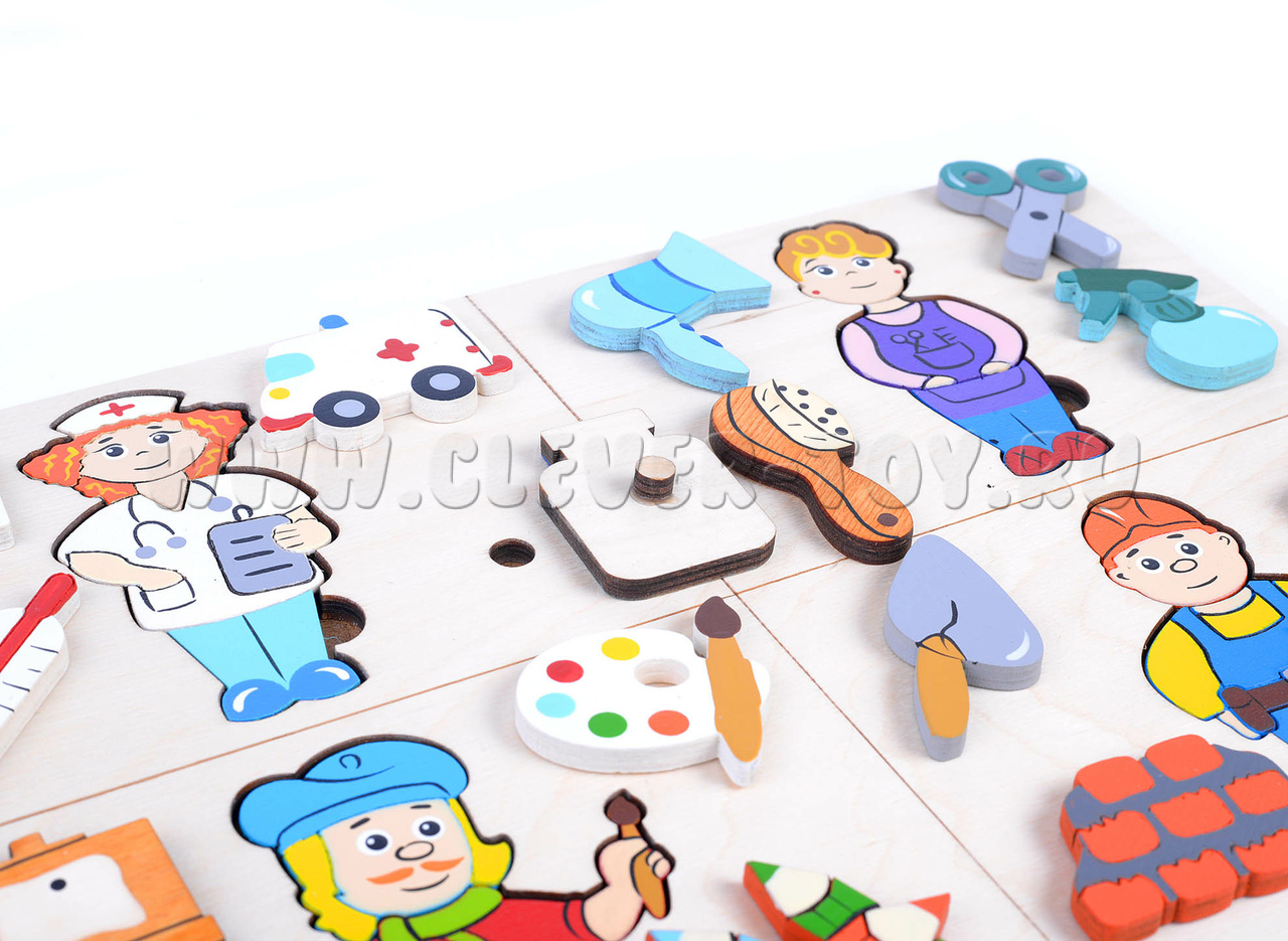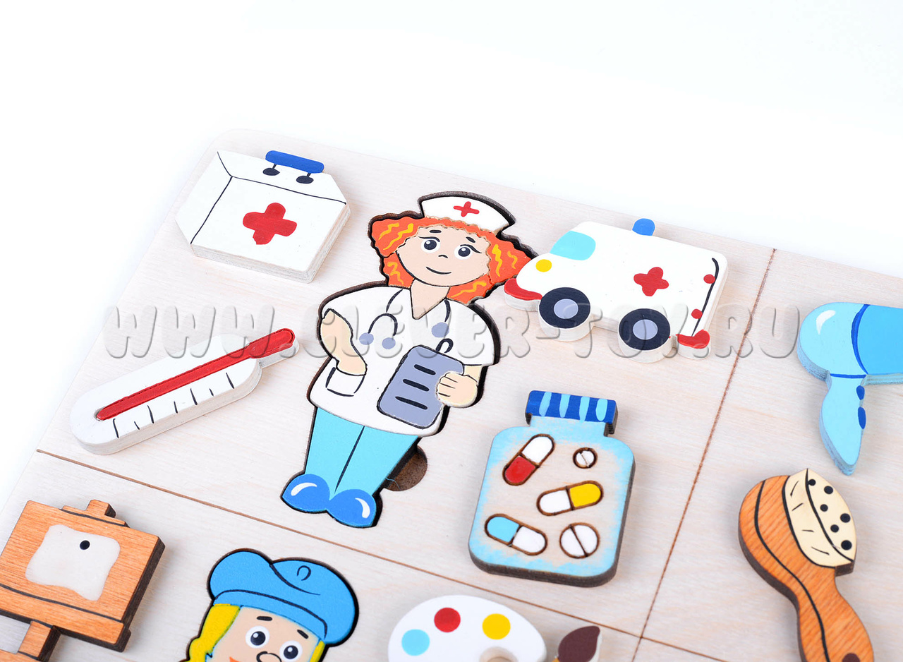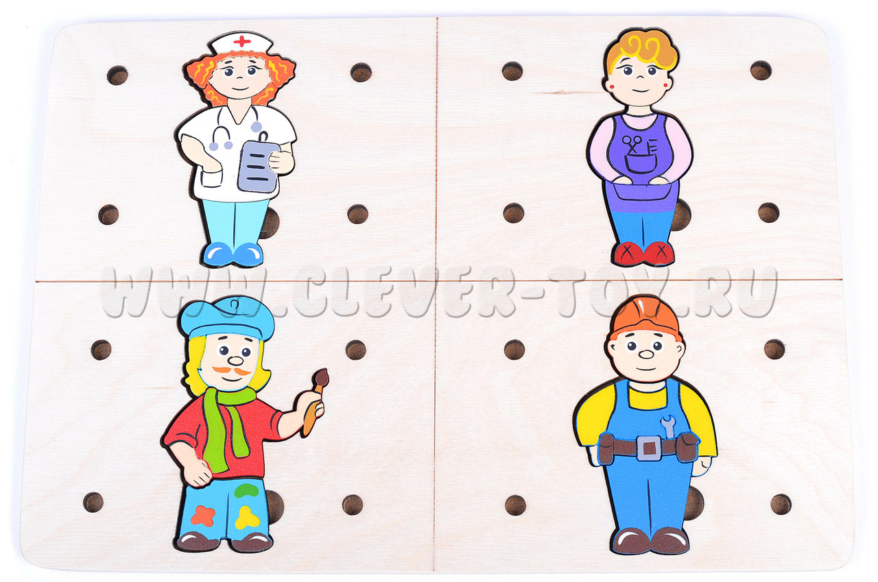 - Деревянное поле, рамка-вкладыш, разделенная на 4 сектора, каждый сектор посвящен отдельной профессии;