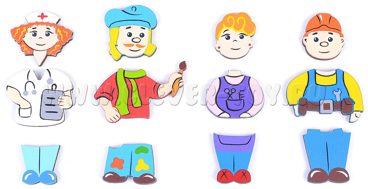 - Фигурки людей 4-х профессий (вкладываются в рамку, составные): Врач, Парикмахер, Художник, Строитель;