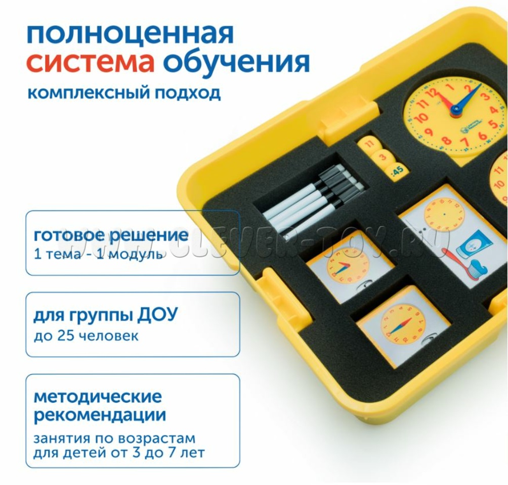 Модуль "Ориентировка во времени" - это инструмент для педагогов детских садов, предназначенный для работы с детьми от трёх до семи лет, который соответствует федеральным государственным образовательным стандартам дошкольного образования. Благодаря модулю дети научатся определять время по часам и событиям, освоят понятия "до", "после", "сейчас", "вчера" и "завтра", разовьют представление о временной последовательности и длительности событий, получат навыки планирования и научатся понимать порядок событий.