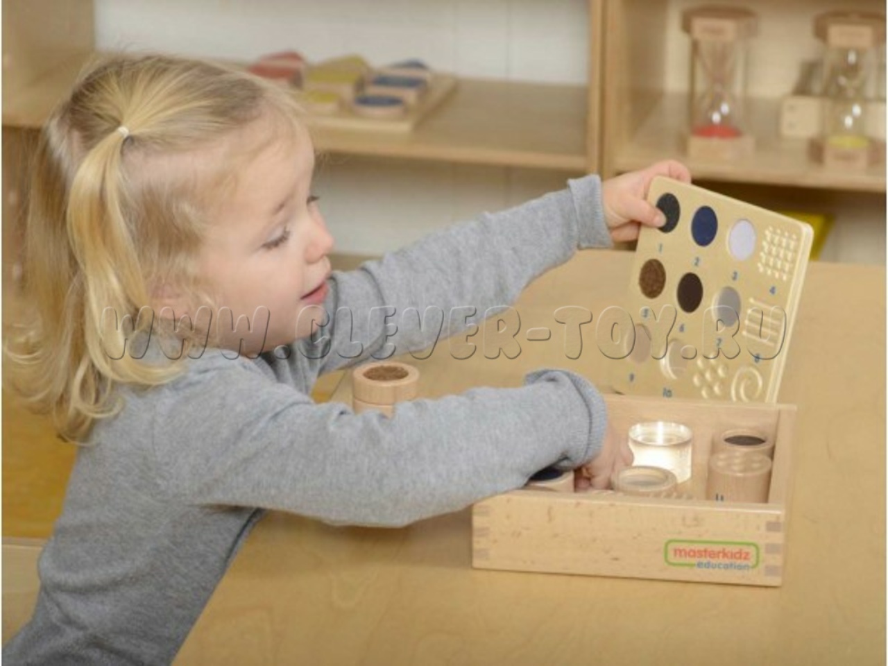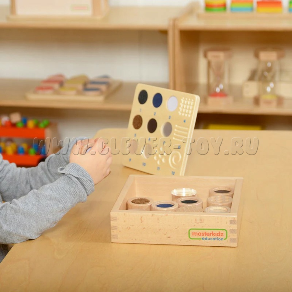 • 12 деревянных бочонков с номерами, имеющих различные текстуры или рельефные рисунки на верхней поверхности. Можно использовать с набором "Тактильный ящик" (артикул ME04055)